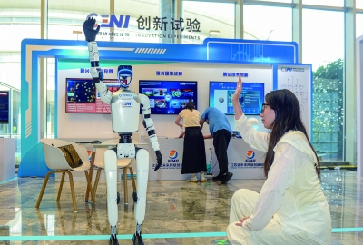 8月19日,在南京上秦淮国际文化交流中心,第九届未来网络创新技术与成果展示亮相。图为未来网络实验设施(CENI)创新试验展台的灵犀导览机器人与观众互动,其具备语音交互、点位讲解、自主导航等功能。